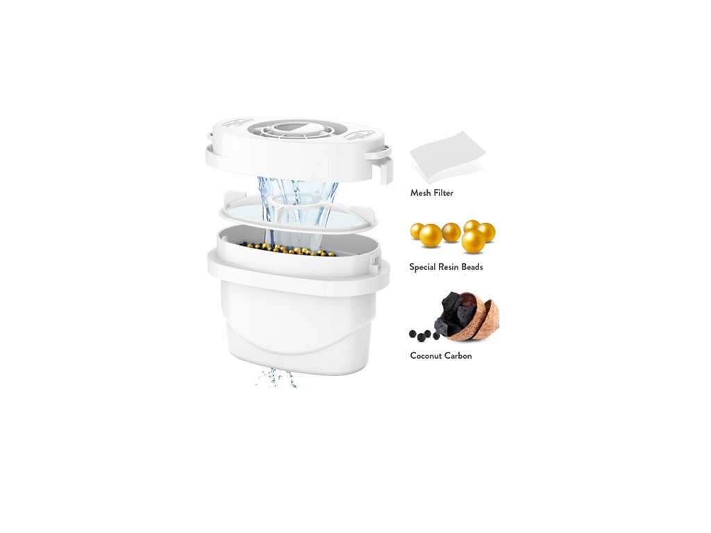 - odstraňuje nečistoty a nežádoucí látky z vody, včetně mikroplastů, herbicidů, pesticidů, olova a těžkých kovů.