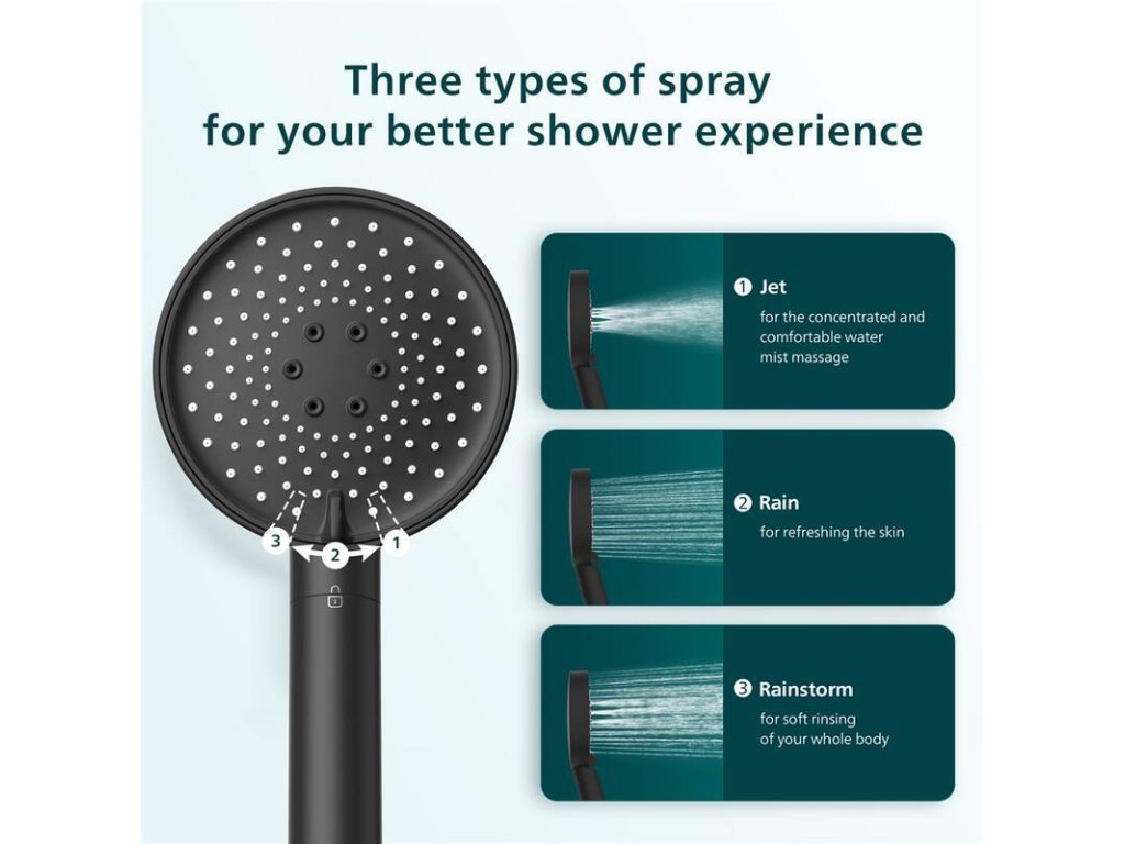 Hlavice nabízí tři režimy proudu: smíšený pro oplachování celého těla, jemný pro obličejovou masáž a tlakový proud, který zajišťuje relaxaci unavené pokožky.