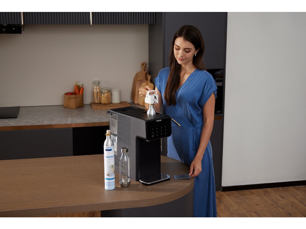 Funkce sycení umožňuje připravit perlivou vodu podle vaší chuti, kdykoli si to přejete. Díky inovativní páce můžete snadno regulovat úroveň sycení čerstvě natočené vody. Přístroj je kompatibilní s běžnými CO2 bombičkami o kapacitě 60 litrů, které se snadno vyměňují a zajišťují nepřetržitý přísun perlivé vody.