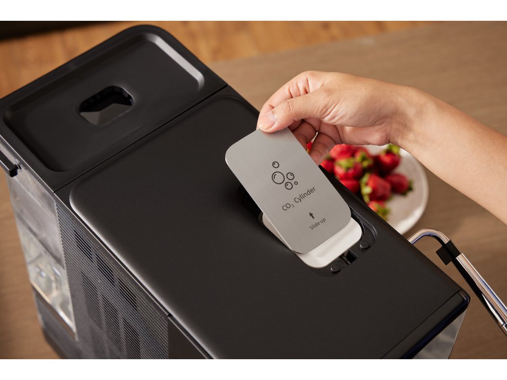 Funkce sycení umožňuje připravit perlivou vodu podle vaší chuti, kdykoli si to přejete. Díky inovativní páce můžete snadno regulovat úroveň sycení čerstvě natočené vody. Přístroj je kompatibilní s běžnými CO2 bombičkami o kapacitě 60 litrů, které se snadno vyměňují a zajišťují nepřetržitý přísun perlivé vody.